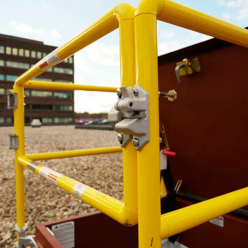 Satisfies the requirements of OSHA 29 CFR 1910.23. Standard self-closing and latching gate feature ensures that the opening is protected at all times. Non-penetrating attachment attaches directly to the roof hatch capflashing. Fits all brands of roof hatches with capflashing. Light-weight design can be easily moved to the roof level. Available in a variety of sizes to accommodate any roof opening and can be easily installed on new or existing hatches. High visibility safety yellow color. Corrosion resistant construction carries a 5-year warranty.