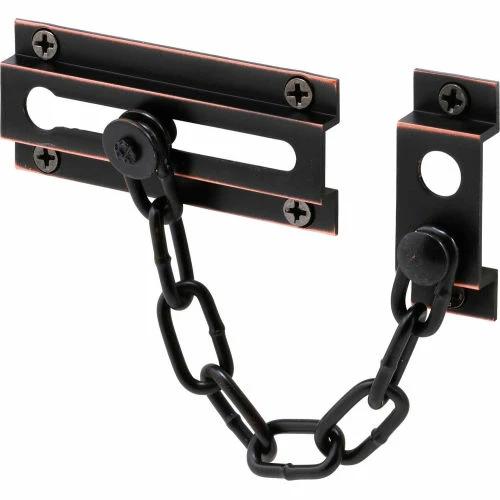 Secures door while allowing viewing and ventilation. Solid brass keepers. Steel chain. Easy to install, installation screws included. Bronze finish.