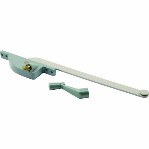 This casement operator is constructed of a diecast body, a hardened steel arm (with a steel guide button at 9/16 inches in diameter), and a case-hardened worm gear mechanism that comes in a corrosion resistant plating. It features a teardrop-shaped housing and an operator crank handle, and comes finished in an aluminum painted color. This Prime-Line casement operator is left-handed, determined when viewing the window from the inside looking out. It is a face-mounted design that installs on older, crank-out casement, steel window frames with 3-7/8 inch and 4-3/4 inch mounting hole centers. This high-end quality operator exhibits minimal gear lash, with positive and smooth operation. For the opposite handing of this operator, see model number H-4288. Installation fasteners and a set screw (for affixing the crank handle onto the operator spindle) are included with each operator.