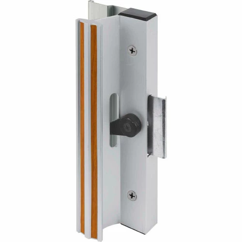 Extruded aluminum inside pull with wood grain feature strip. Clamp-latch with metal activator. Flush extruded aluminum outside pull. Used by many glass door manufacturers.